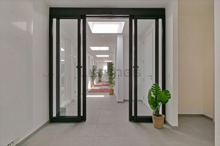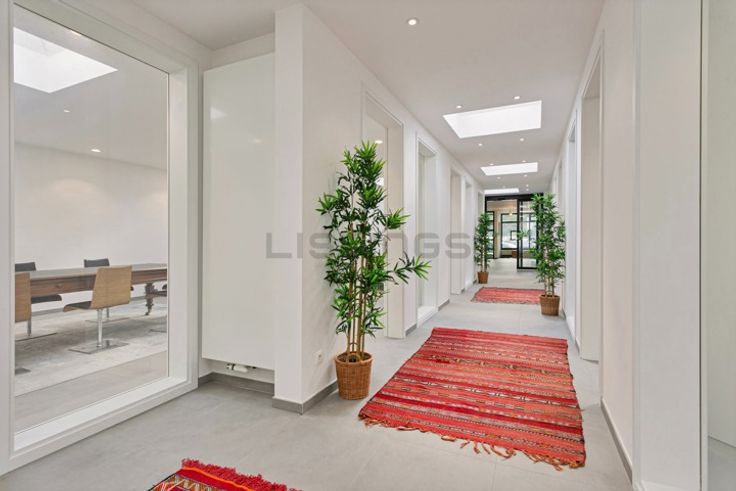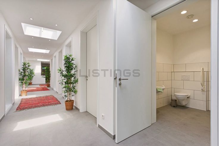 Via de automatische glazen Tormax schuifdeur komt u in een gang met langs beide kanten 2 grote ruimtes die eenvoudig op te delen zijn in 7 kleinere kantoren/praktijkruimtes. De ruimtes zijn voorzien van elektrische transparante koepels voor extra veel lichtinval, verwarmingstoestellen en de nodige wateraansluitingen.