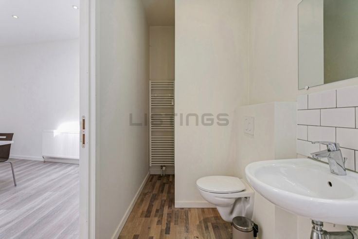 Op de eerste verdieping, bevinden zich 2 grote ruimtes met sanitaire voorzieningen (toilet en douche). In één van de twee ruimtes is er eveneens de mogelijkheid om een extra keuken te plaatsen zodoende te dienen als lunchruimte.