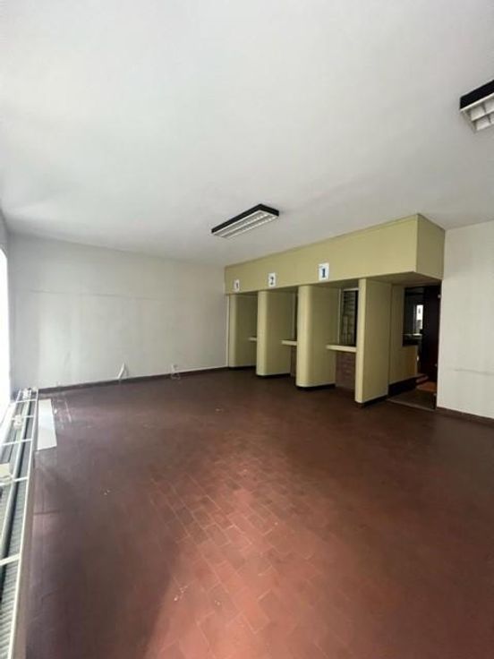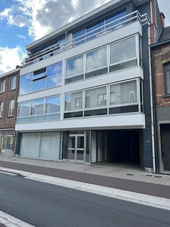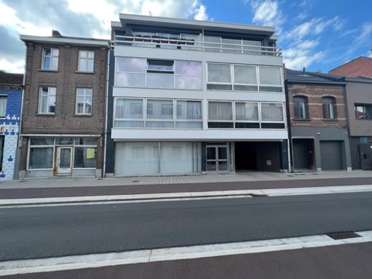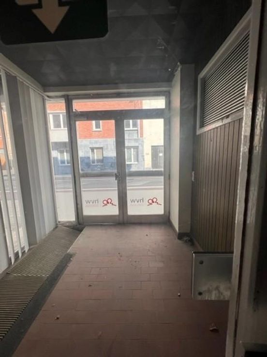 Het gelijkvloerspand bestaat uit een grote open ruimte die naar wens kan worden ingedeeld. Via een inkomhal, met sas, aan de straatkant kom je binnen in een wachtzaal met gesloten, demonteerbare loketten. Grote raampartijen aan de voorzijde zorgen voor een aangename lichtinval. Achter de loketten bevindt zich een grote open ruimte met eveneens veel lichtinval. Er is een kleine keuken geïnstalleerd achteraan in het gebouw en eveneens een centraal gelegen toilet. Er is een tweede inkom via de gemeenschappelijke inkomhal van de bovenliggende appartementen. G score: D P score: D