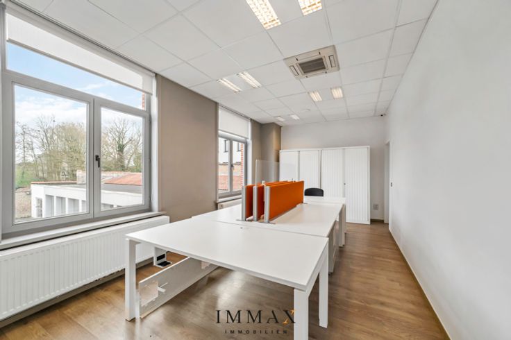 Dit prachtig historische pand 'Hof van Versailles' werd omgebouwd tot een modern kantoorgebouw (1000m² bruto - 811 m² netto) met hoogstaande, kwalitatieve afwerkingsgraad. Door de centrale ligging nabij de stadskern biedt dit pand tal van mogelijkheden voor ondernemers. Indeling: - Gelijkvloers (461 m²) bestaande uit inkomhal met ontvangstruimte, kantoorruimte (173 m²), vergaderzaal (30 m²), bergruimte / archief (25 m² - 50 m²), sanitaire ruimte en keuken, - 1e verdieping (200 m²) bestaande uit directiebureel, kantoorruimte (21 m² - 78 m²), toonzaal (75 m²) en sanitaire ruimte. - 2e verdieping (150 m²) bestaande uit trainingszaal/vergaderruimte (40 m²) en archief (107 m²). Afwerking: Tegelvloer, spot- / LED-verlichting, dubbele beglazing met houten schrijnwerk, centrale verwarming via warmtepompen, airco, alle data-bekabeling, alarm. Troeven: - Historisch pand - Grondige renovaties (2002 en 2016) - Parking: circa 12 wagens (uitbreiding mogelijk bij buren) - Centrale topligging nabij stadskern vlakbij de ring van Brugge