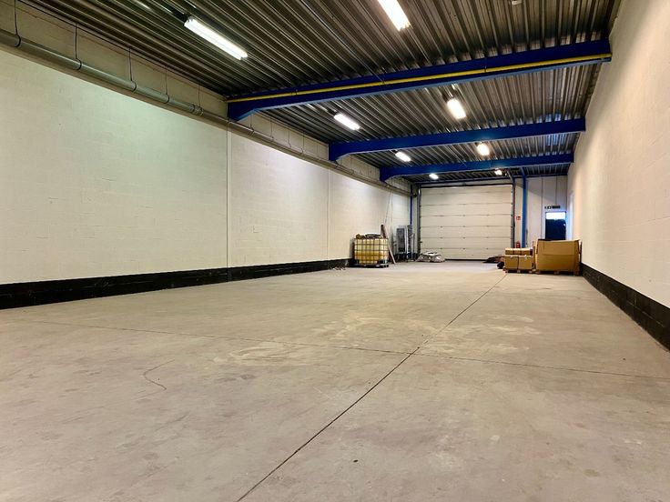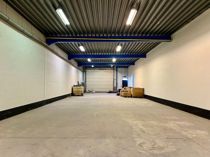 Specificaties: automatische sectionale poort, 4,5m vrije hoogte, geïsoleerd steeldeck dak, polybetonvloer, tl-armaturen