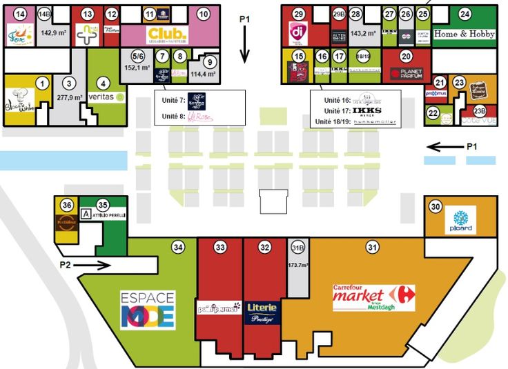 Winkelcentrum in de open lucht met verschillende nationale borden, waaronder : Carrefour Market, IKKS, Picard, Veritas, Hunkemöller, Proximus, Di, Poils & Feathers, Prestige Bedding... 33 winkels verspreid over 10.000M².
