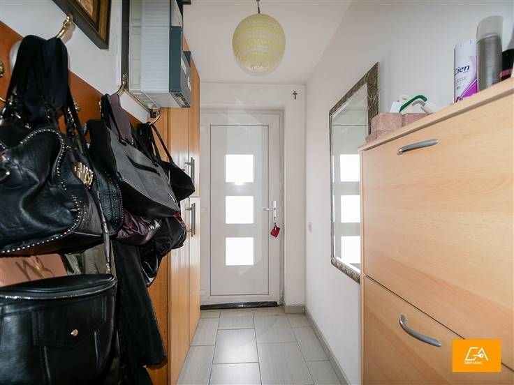 Bij het betreden van de woning bevinden we ons in de inkomhal. Deze geeft uit op de ruime leefruimte waarin de open keuken is geïntegreerd.
