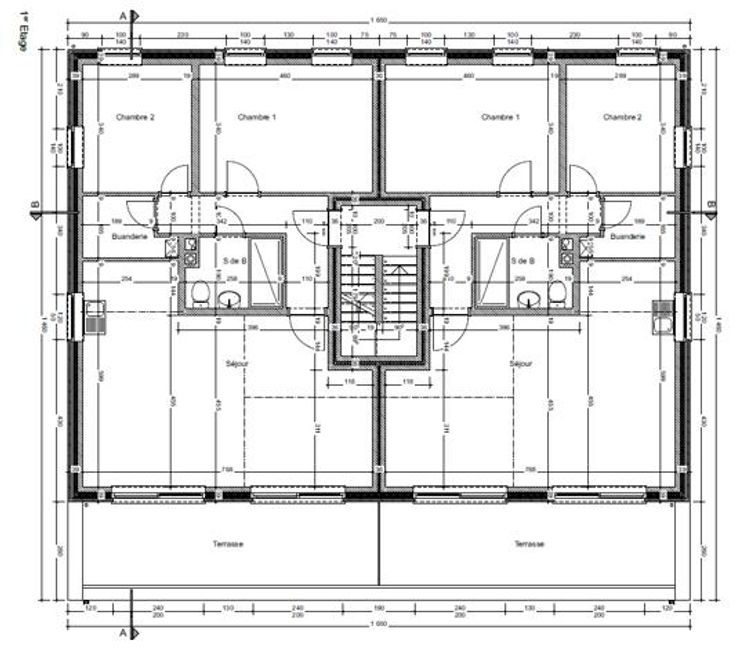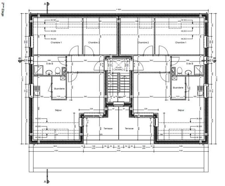 Maison 4 chambres, salles de bains, buanderie, terrasse, jardin, garage et cave pour une superficie de +/- 130m² habitable. Composition identique pour les deux maisons.