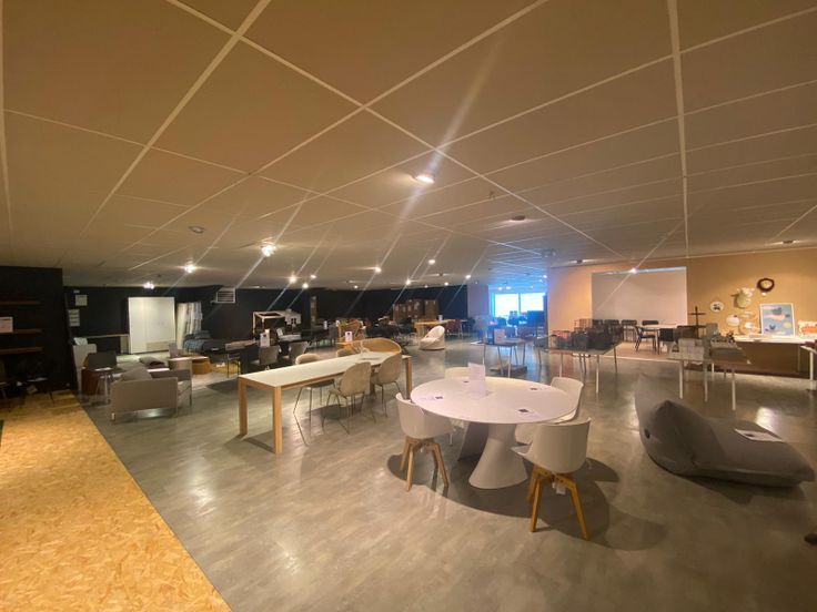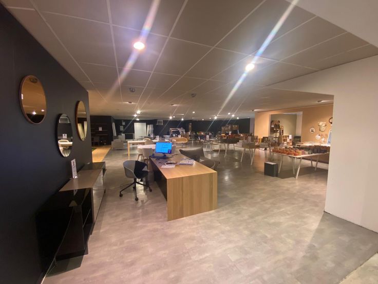 L'entrée est constituée de baies vitrées qui offrent une vue sur les 850 m² d'exposition. Cet espace inclut également une pièce aménageable à l'arrière, permettant parfaitement l'installation d'un bureau. Enfin, des places de parking se trouvent devant le bâtiment.