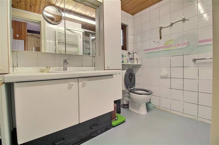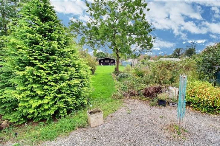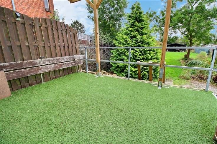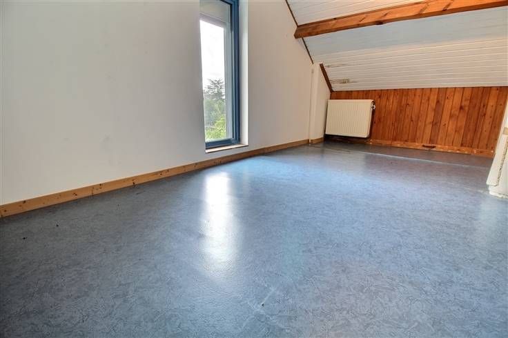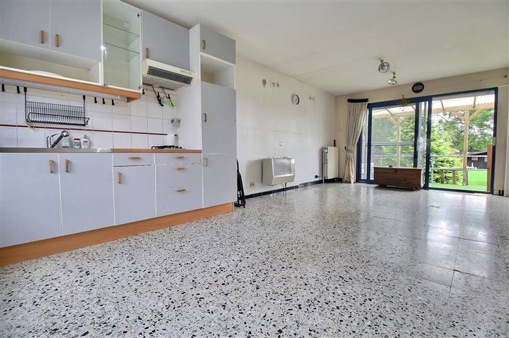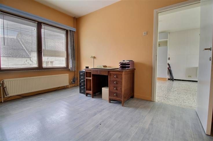 Se compose comme suit : séjour avec cuisine ouverte sur living, salle de douches, wc, accès cave et garage, 2 chambres, 1 bureau, terrasse et beau jardin.