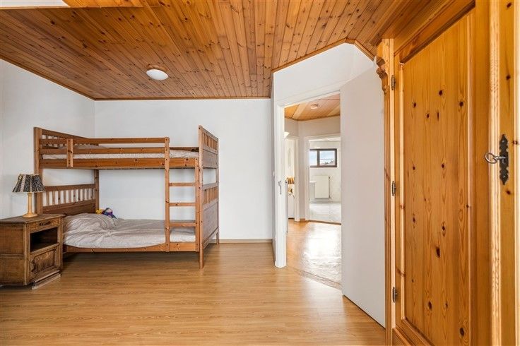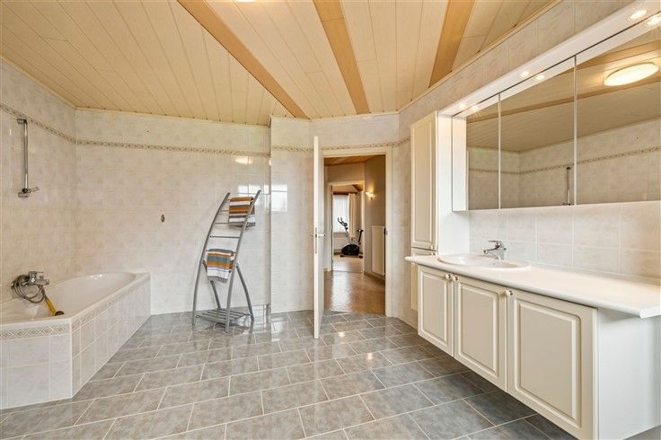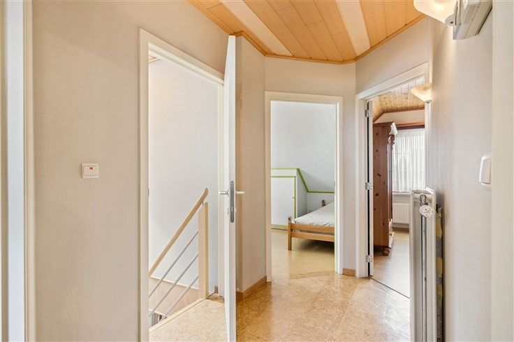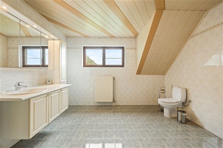 1e verdieping: 3 volwaardige slaapkamers; Grote badkamer met ligbad + douche, lavabomeubel en toilet.