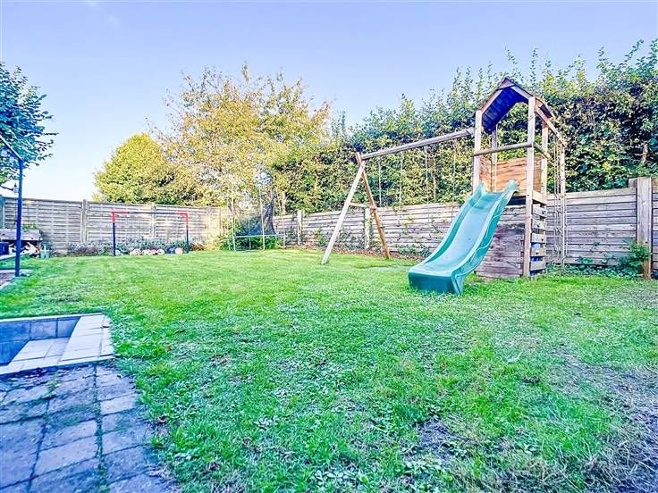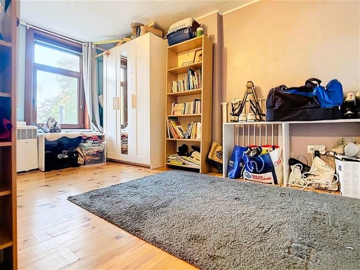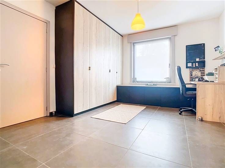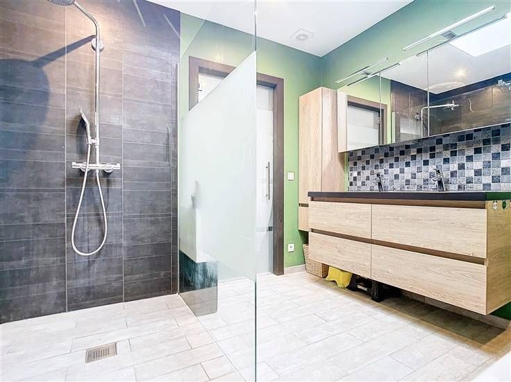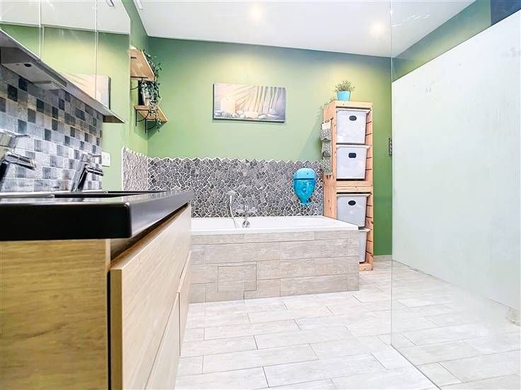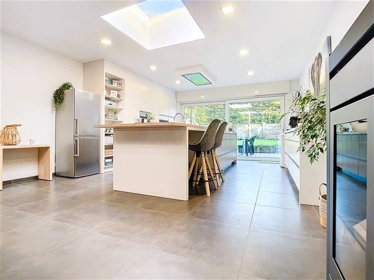 Au rez-de-chaussée, vous découvrirez un hall d’entrée accueillant qui s'ouvre sur un vaste espace de vie. Cet espace comprend un bureau, un salon confortable, une salle à manger conviviale et une magnifique cuisine entièrement équipée, dotée d'un îlot central avec un coin repas supplémentaire. La grande baie vitrée offre une vue sur le jardin. Pour compléter ce niveau, vous trouverez une salle de bains moderne, équipée d’une baignoire, d’une spacieuse douche à l’italienne et d’un meuble lavabo avec double vasque.