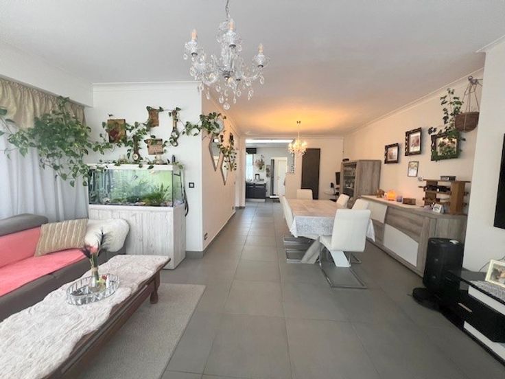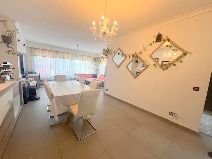 Ruime lichte L-vormige living met gedeeltelijke open moderne speciale keuken (vaatwasser, ingebouwde koelkast + ingebouwde vriezer en combi-oven, bij keuken is er een knusse eethoek,achter de keuken een kleine berging die ook als technische ruimte ingedeeld is, aparte WC, extra ruimte die momenteel als logeerkamer gebruikt word maar ook kan als bureel of speelhoek als bestemming kan krijgen.vloerverwarming