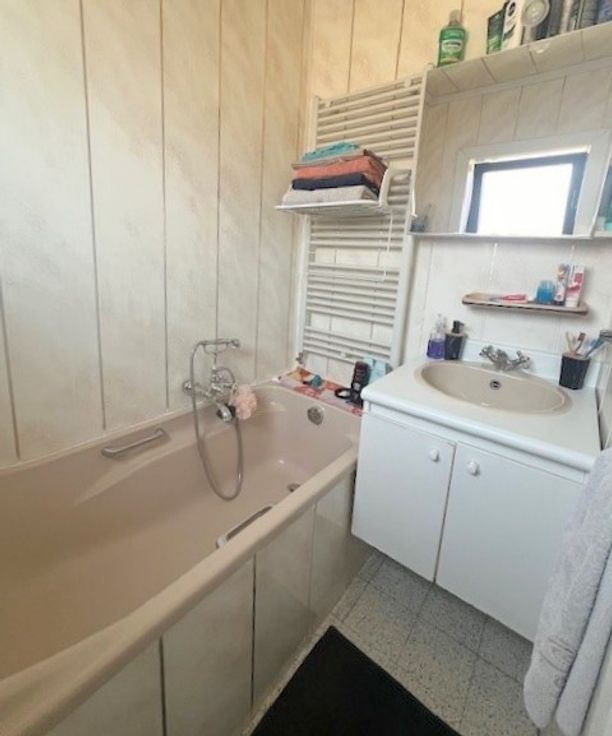 de badkamer met ligbad en lavabo, deze kan een beetje aandacht en liefde gebruiken