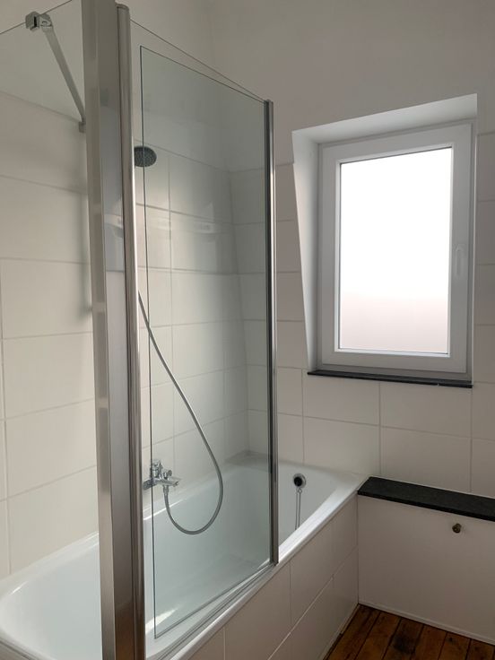 Salle de bain avec baignoire-douche incorporée, radiateur électrique et soufflerie incorporée.