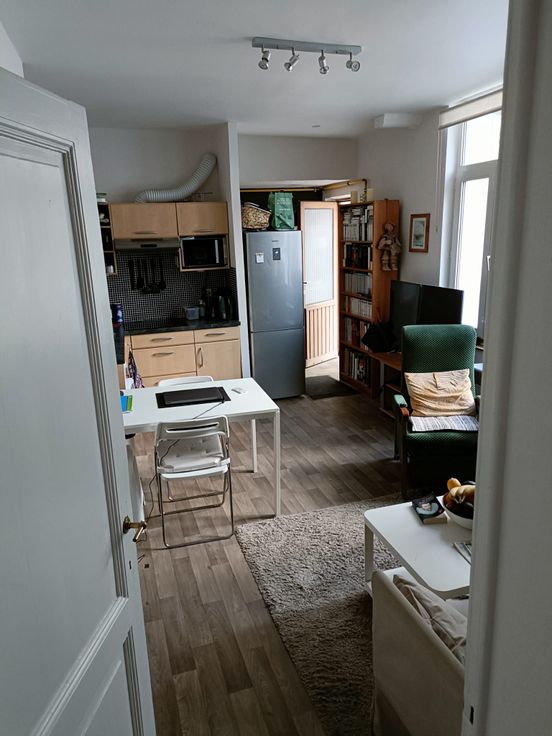 Séjour avec coin cuisine, salle de douche, 2 chambres en enfilade, dont l'une peut servir de bureau.