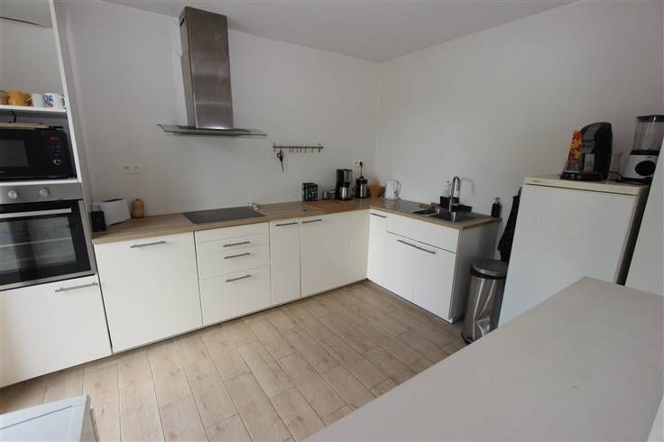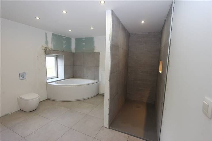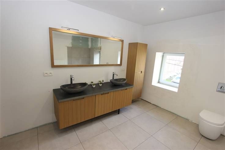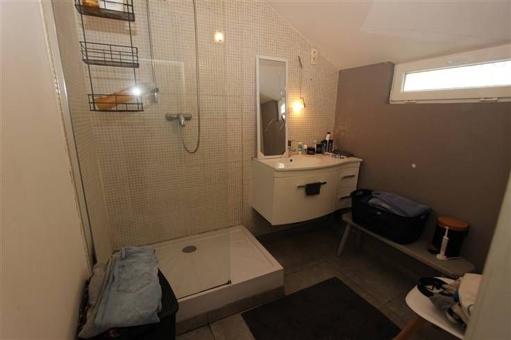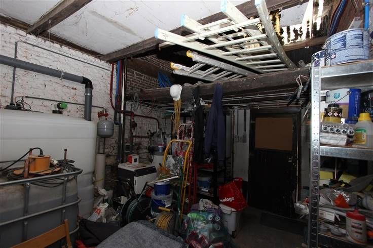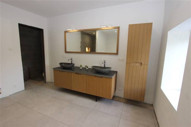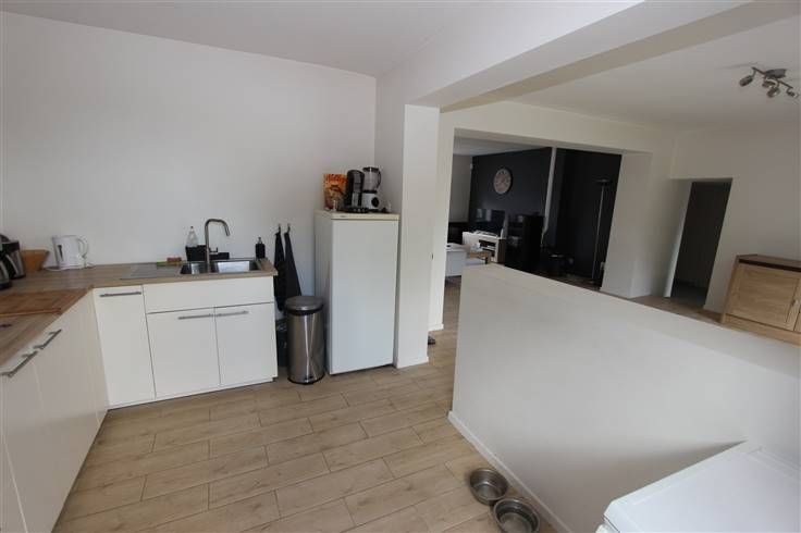 équipée et meublée (2019) (taque vitro céramique, four, hotte, évier), salle de douche (douche et meuble évier), atelier/débarras et toilette. A l’étage : hall de nuit, 3 chambres et salle-de-bains à terminer (baignoire de coin, meuble dble évier et douche). Cave en sous-sol.
