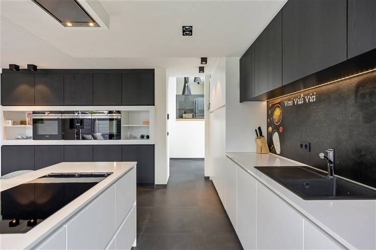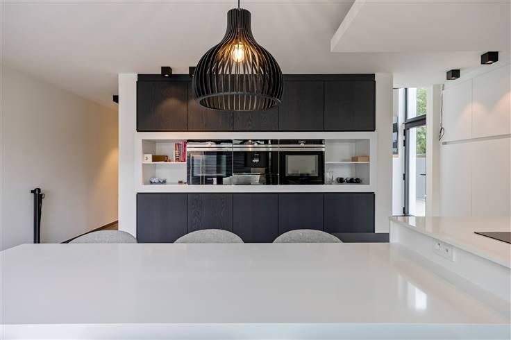De open keuken, voorzien van moderne inbouwapparatuur en strakke kastfronten, is een echte eyecatcher.