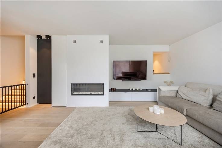 De lichte woonkamer met een gezellige gashaard vormt het hart van de woning en biedt een warme, uitnodigende sfeer.
