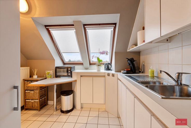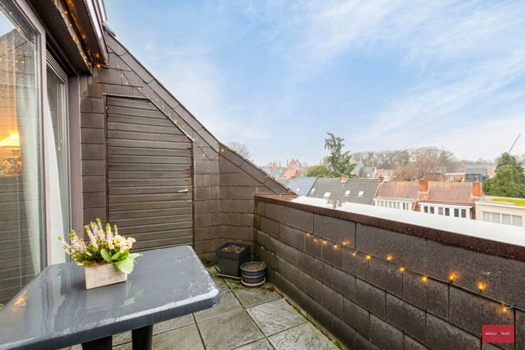 Rustig gelegen dakappartement met zuid terras aan de living. Gelegen aan de Hofpoort en rustig pleintje op de derde verdieping met lift, autostaanplaats en kelderberging. Inkomhal met gastentoilet, living met terras en keuken met ontbijttafel. 2 slaapkamers, wasberging en badkamer. Ideaal gelegen in het centrum en toch zeer rustig op wandelafstand van alle winkels, voorzieningen en de Grote markt. U voldoet direct aan de renovatie verplichting mits het plaatsen van een condensatieketel (zie simulatie). Het appartement is momenteel verhuurd. Ondergrondse staanplaats optioneel bij aan te kopen aan 15.000 euro.