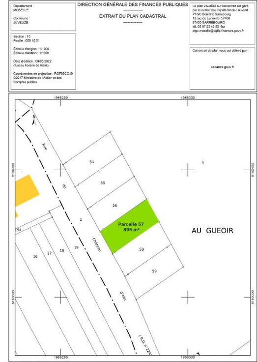 Jean-François LÉVY, conseiller en immobilier 3G IMMO, vous propose en exclusivité, à la campagne et au calme, dans le Pays du Saulnois, un beau terrain viabilisé à bâtir de 895 m², dans le village de Juvelize. La commune de Juvelize est localisée dans le sud du département de la Moselle, dans le Parc naturel régional de Lorraine. Le village est protégé des vents du Nord-Est. Les vues sur la campagne environnante sont très agréables. Nous sommes proches des bassins d'emploi de Château-Salins, de Dieuze et de Sarrebourg qui rassemblent l'essentiel des services publics, activités commerciales et industrielles du secteur. Contrairement à beaucoup de villages lorrains, Juvelize n'est pas un village rue comme on en rencontre beaucoup en Moselle. Malgré la reconstruction d'après-guerre, il a conservé son charme. Les fermes qui étaient au centre du village ont été reconstruites à sa périphérie. Le maire et son équipe municipale sont très dynamiques et sont à l'écoute des attentes des administrés. Le terrain totalement viabilisé fait partie d'un petit lotissement « Le Geoir » de 6 parcelles (5 372 m² de superficie totale), en extension du tissu urbain du village vers Dieuze. Il s'agit de la dernière parcelle disponible, sur les 6 proposées initialement à la vente. Ne tardez pas, c'est votre dernière chance d'acquérir ce bien ! La parcelle est desservie par l'ensemble des réseaux : Assainissement Eaux pluviales Réseau électrique Télécommunications Plans des réseaux sur