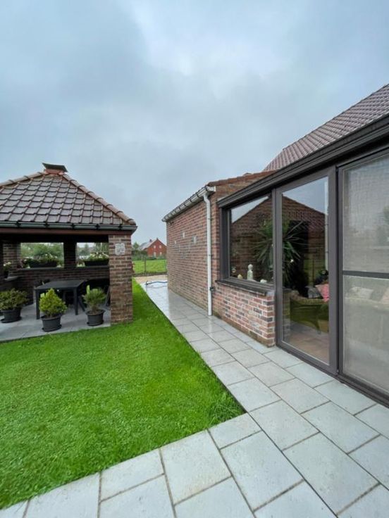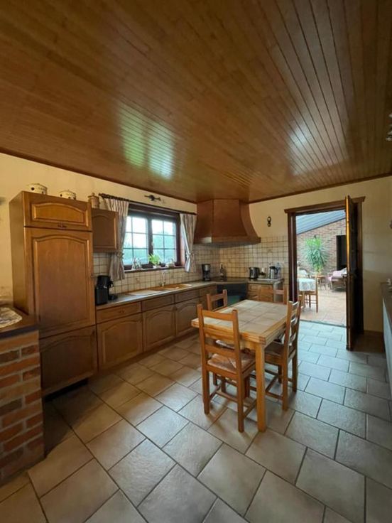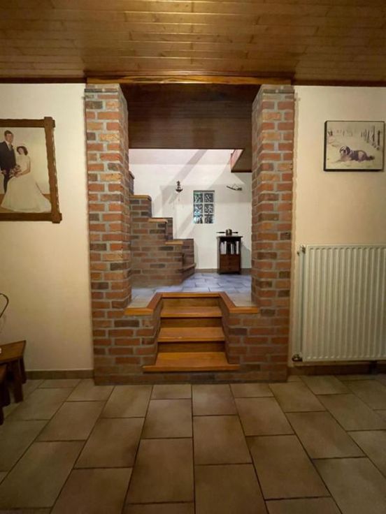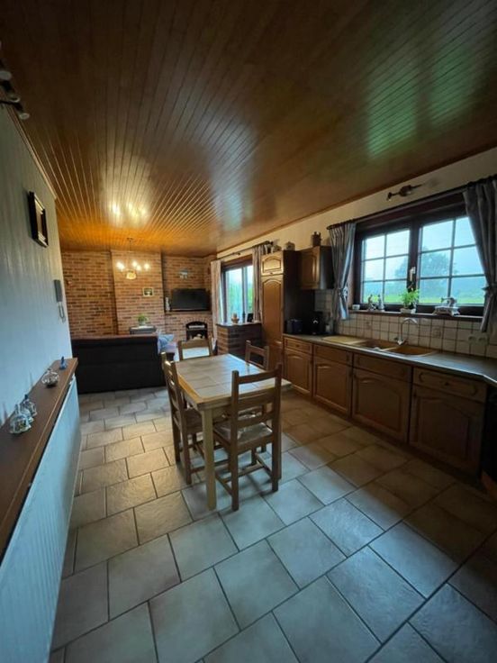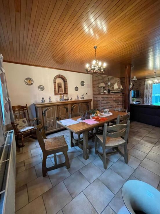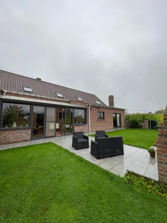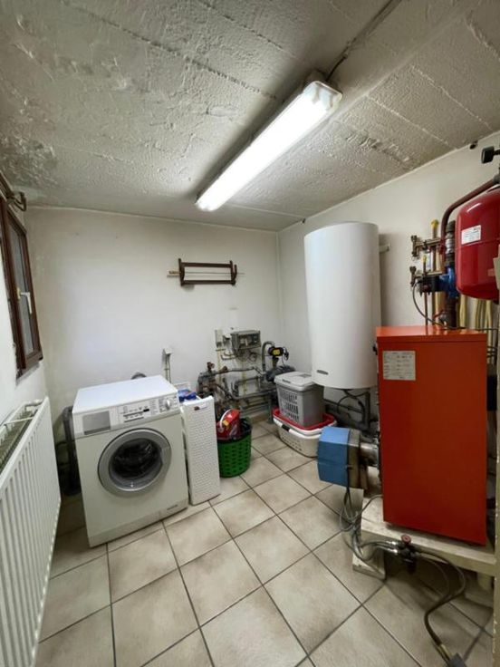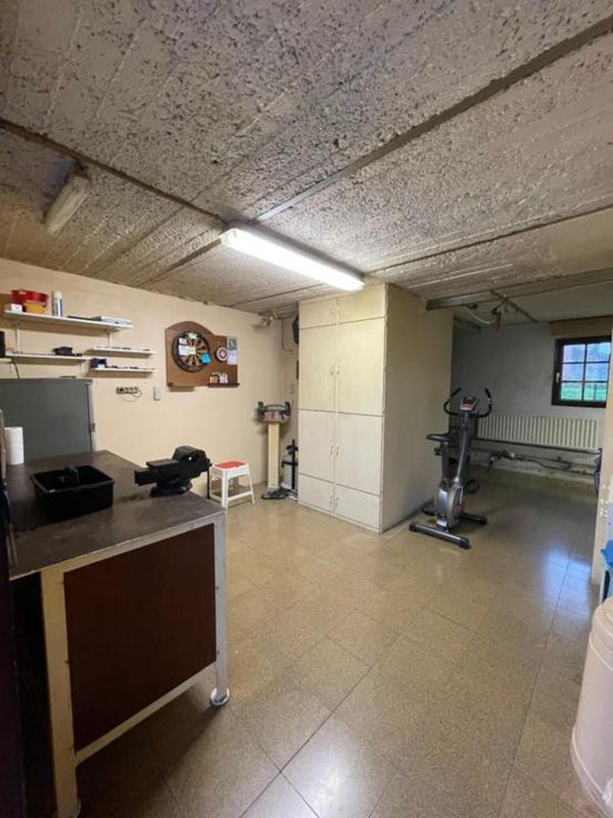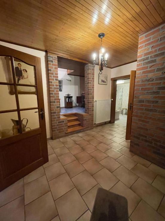 Magnifique villa 4 façades, avec garage (2 voitures), parking et beau jardin, point d’eau, en excellent état d’entretien. La maison se compose comme suit : Au sous-sol : bonne cave (sèche) Au rez-de-chaussée : hall d’entrée desservant un WC, une salle de bains (bain, douche, lavabo), une salle à manger, un salon (feu au bois), une cuisine ouverte équipée (frigo, double évier, taques électriques, hotte), une véranda, une buanderie (chaufferie), un garage (2 voitures – porte sectionnel) donnant accès au grenier. Au premier étage : hall de nuit desservant 3 chambres. Excellent état d’entretien. RC hyper bas. Electricité conforme. Alarme Double vitrage Bonne toiture – sous toiture Citerne d’eau de pluie Groupe hydrophore Raccordement à l’égout al (mazout) Citerne à mazout (- de 3.000L) Annexe Terrasse Magnifique jardin (BBQ, point d’eau) Renseignements généraux : SUP : 18a 60ca RC : 448€ PEB : F Contrôle de l’installation électrique : conforme Réduction des droits d’enregistrement et abattement possibles sous condition