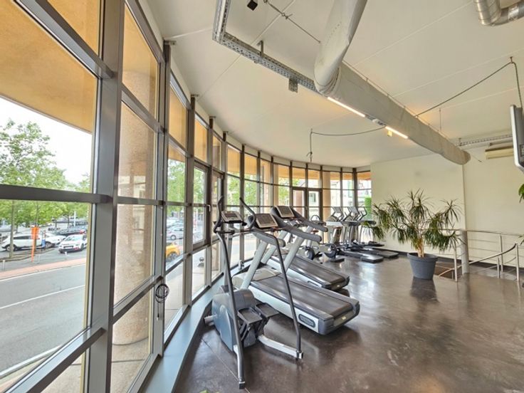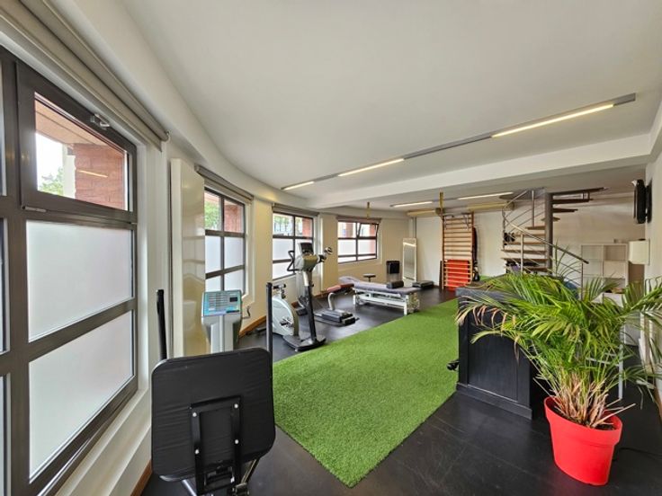 - indeling verdiep (eveneens rechtstreeks toegankelijk vanop de Weg Naar As): receptie, 2 polyvalente ruimtes momenteel ingericht als fitness, omkleedruimtes met douches, apart toilet en bureelruimte