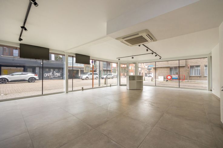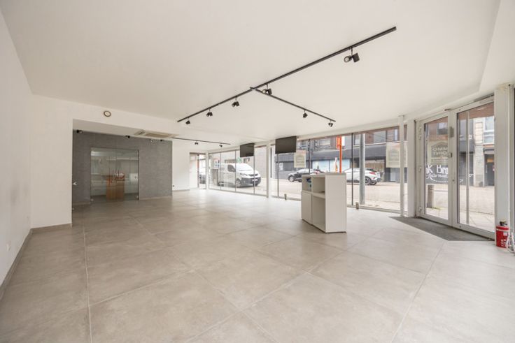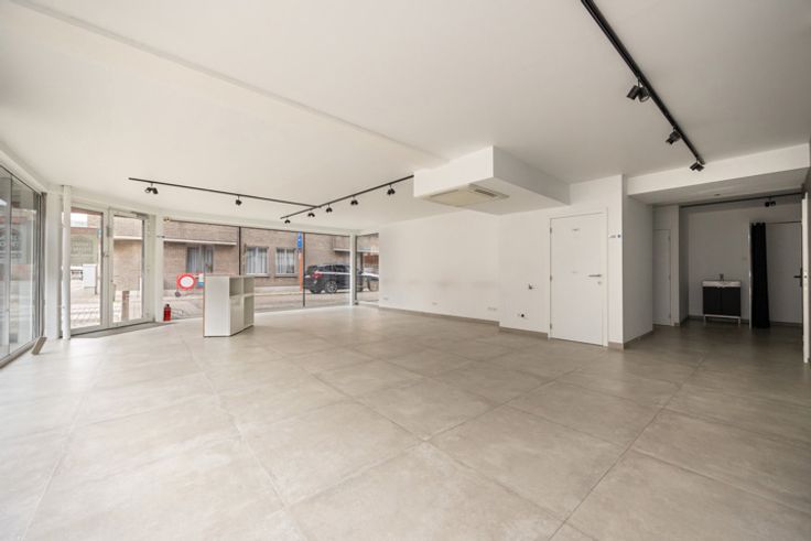 Handelsruimte van in totaal 122 m² (bruto vloer-oppervlakte) op tegel met zeer veel lichtinval dankzij grote vitrineramen.