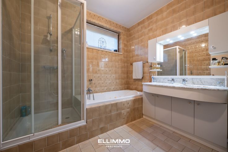 Hal in dezelfde natuurstenen vloer, met links 3 slaapkamers, badkamer met bad, douche en een dubbele lavabo met meubel, apart toilet, bureel of slaapkamer 4, volledig geïnstalleerde keuken met toegang naar de het terras aan de achterkant van de woning, ruime, gezellige leefruimte met een schuifraam naar het terras aan de zijkant met een prachtig uitzicht over Bilzen.