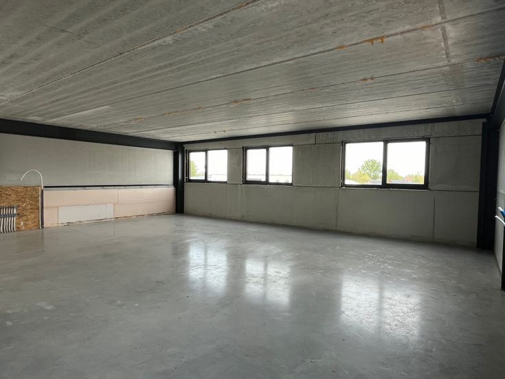 Op het eerste verdiep bevindt zich de mezanine van 45 m². Op het tweede verdiep bevindt zich een kantoorruimte van 115 m² die kan bijgehuurd worden voor 800 EUR/maand.