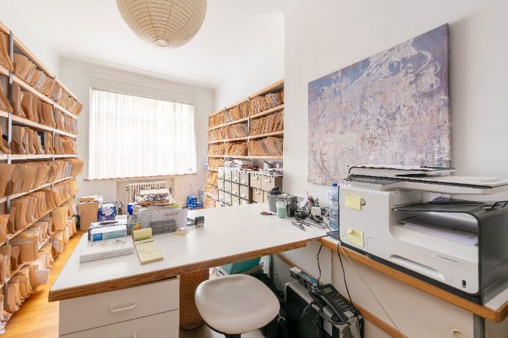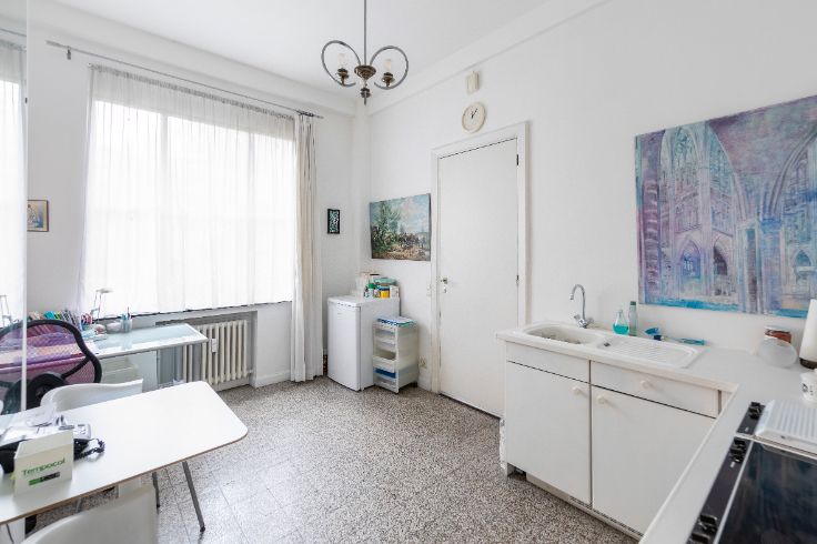 Het kantoor bestaat uit 6 kantoren, 2 badkamers en een keuken. Een garage (ingang via Rue Lens) wordt afzonderlijk verkocht en is optioneel voor €40.000. Een dienstbodenkamer en een grote kelder worden samen met het pand verkocht. Fietsenstalling - Collectieve gasgestookte ketel met warmtekrachtkoppeling - zonnepanelenproject al goedgekeurd tijdens de Algemene Vergadering - Waterontharder.