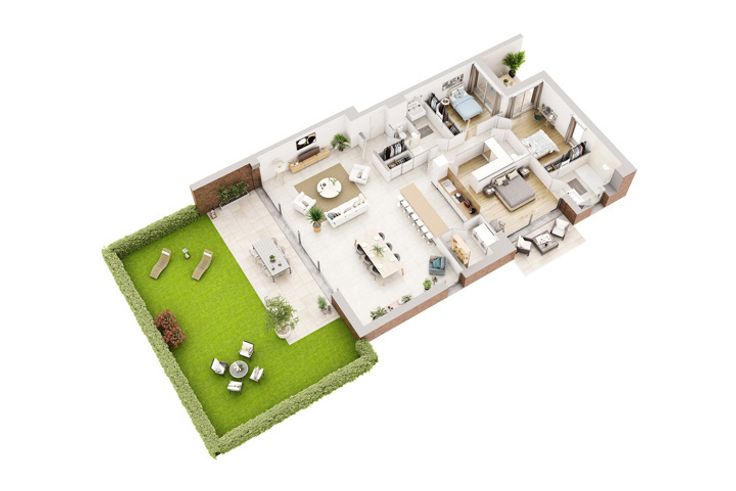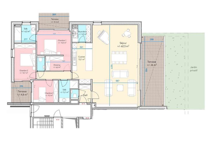 Caractéristiques générales : Hall d'entrée, 2 WC séparés avec lave-mains, 3 chambres dont une avec dressing et salle de bain avec baignoire, une salle de douche, un meuble vasque et miroir avec éclairage dans chaque pièce d'eau, séjour avec cuisine équipée ouverte, buanderie, balcon, 2 terrasses, jardin privatif et ascenseur.