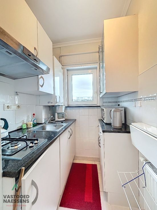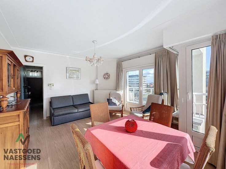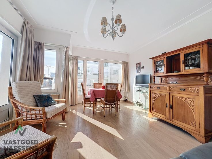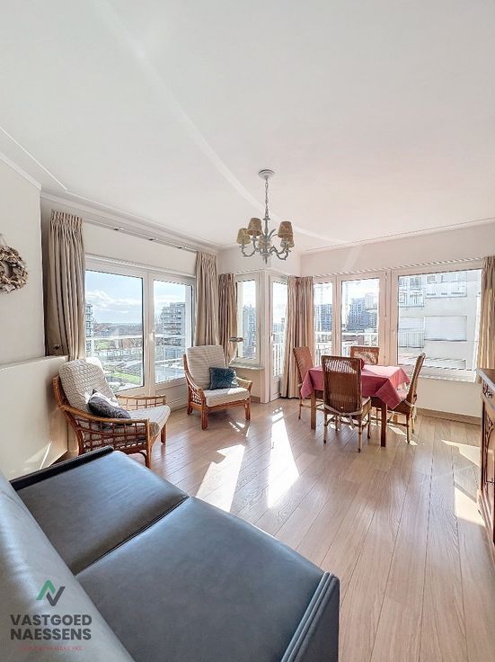 Dit gemeubeld 1 SLPK appartement is gelegen op de 6de verdieping van de residentie "Waldorf". Het appartement is volledig instapklaar (inclusief kasten, bed, slaapbank, gordijnen en rolgordijnen) en beschikt over 2 mooie terrassen waar u volop van kan genieten aangezien u de hele dag zon heeft en zijdelings zeezicht. Het appartement is als volgt ingedeeld: 1 slaapkamer met terras die ook toegang geeft tot de badkamer, een afzonderlijk toilet en een keuken die uitgerust is met toestellen. Verder een mooie woonkamer met veel lichtinval en het 2de terras. Het is heel goed onderhouden en stapsgewijs vernieuwd: ramen (PVC en dubbel glas), vloeren, keuken, badkamer, condensatieketel, gevelisolatie en een veiligheidsdeur. Het appartement heeft niet alleen de zon als troef, ook heeft het een kelder en 2 fietsplaatsen en het wordt gemeubeld verkocht. De residentie is gelegen op een paar meter van de zee in het rustige Mariakerke, doch op wandelafstand van de Wellington Golf, Casino en het commercieel centrum van Oostende.