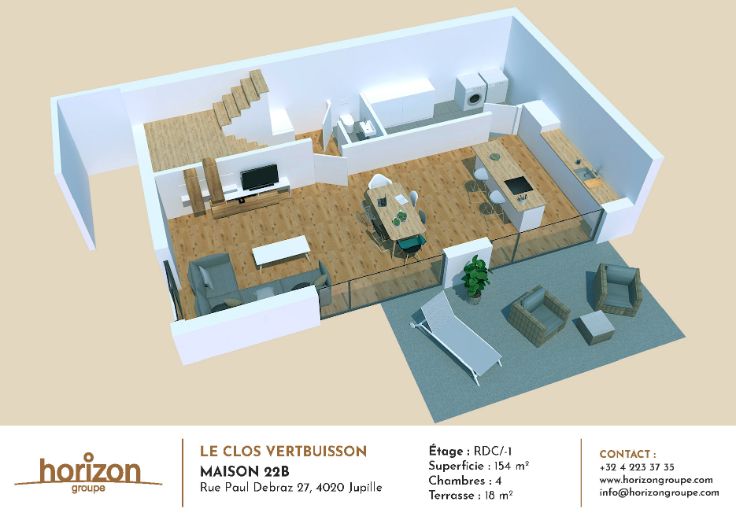 Plongez dans l'élégance d'une maison contemporaine 3 façades, superbement positionnée au sein du Clos Vertbuisson. Cette réalisation en cours de construction proposera 3 chambres, un spacieux espace de vie qui s'ouvre gracieusement sur le jardin arboré. Avec une buanderie pratique, une grande terrasse et un jardin, cette maison a été conçue pour offrir un style de vie inégalé. Vous bénéficiez d'un carport privé. La superficie généreuse de 150 m² offre un espace de vie raffiné au cœur de la nature. Idéalement située sur les hauteurs de Jupille, cette habitation offre un havre de paix tout en restant à proximité immédiate des écoles, des commerces et de tous les services dont vous pourriez avoir besoin. Ne manquez pas cette opportunité de vivre dans le confort et l'harmonie de cette maison contemporaine au cœur de l'éco-quartier Le Clos Vertbuisson. Contactez-nous dès maintenant pour au 04/223 37 35 ou via info@horizongroupe.com