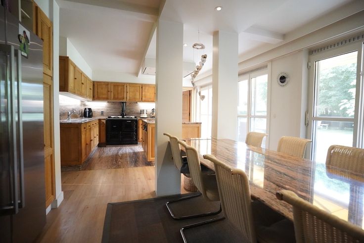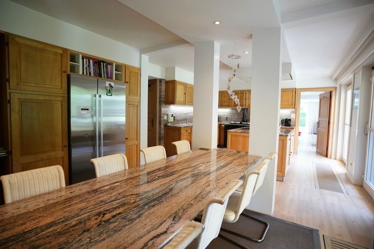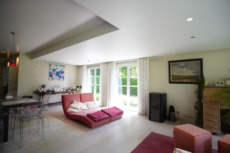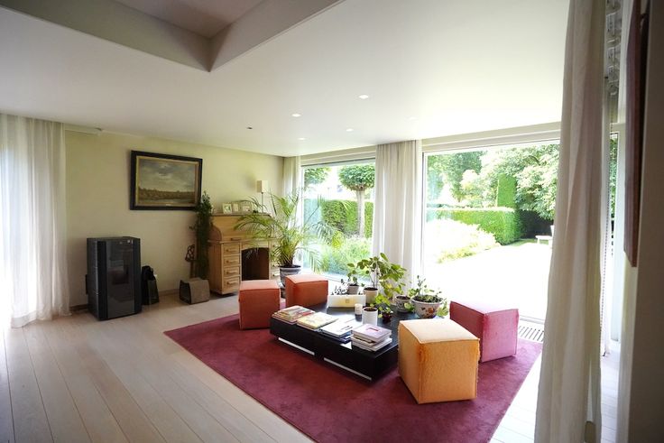 Gelijkvloers: bijzondere leefruimte met open blik op de tuin (70 m²) - royale keuken met eetmogelijkheid voor 8 - lichtrijk en tuingericht bureel (voor mezelf zou dit de slaapkamer worden) - 2 x éénpersoonsslaapkamer met badkamer - was- en strijk en toegang tot een koele kelder en een grote garage (wagen en fietsen)