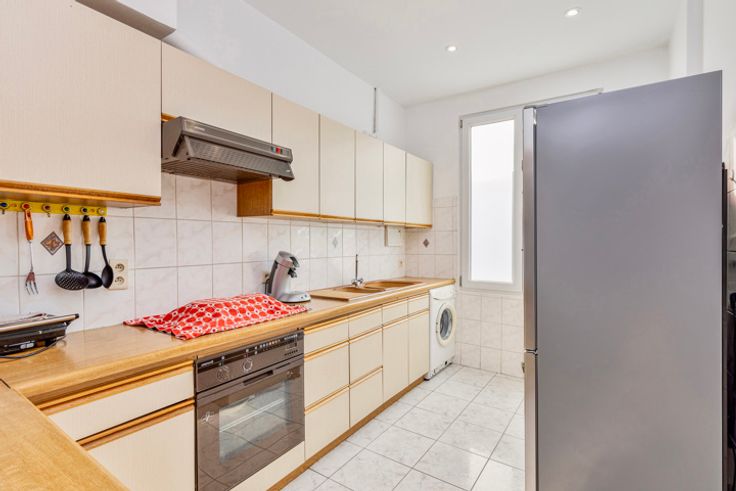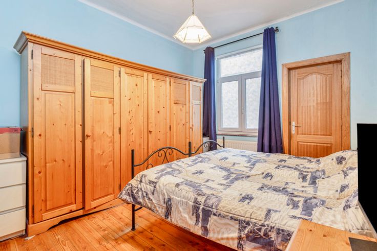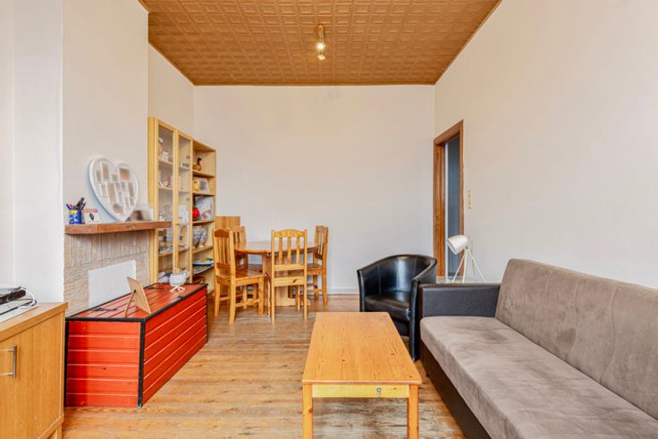 Dit mooie appartement ligt in een authentiek gebouw met maar 7 appartementen. Via de veiligheidsdeur betreden we de inkomhall van het appartement die toegang verschaft tot de verschillende aparte ruimtes waaronder het toilet, slaapkamer, woonruimte en keuken. De keuken is uitgerust met een dampkap, keramische kookplaat, oven en er is ook een plaats voorzien voor de wasmachine. De badkamer beschikt over een mooie inloopdouche en enkele lavabo met onderbouwd kastje. De zeer ruime slaapkamer biedt plaats voor een grote dressing, een bureel of een bijkomende slaapkamer. Het appartement heeft dezelfde mooie, hoge plafonds als een herenwoning en geniet hierdoor van zeer mooie lichtinval en geeft een zeer ruimtelijk gevoel. De plafonds zijn dus ook makkelijk bij te isoleren via een verlaag plafond. De houten vloer en hoge deuren zijn mooie, authentieke elementen. De opbergruimte wordt verzekerd door de individuele, ruime kelder van ongeveer 13,5m². Alle tellers zijn individueel. Er is een syndicus en de gemeenschappelijke lasten in dit kleinschalige gebouw bedragen ongeveer 115€/maand. Het appartement is ook ideaal gelegen en bevindt zich op wandelafstand van alle openbaar vervoer. Vlak voor de deur is er een Delhaize en in dezelfde straat ligt ook nog een Colruyt. De Aldi, Lidl, Zeeman, Wibra en Action bevinden zich op 10 minuten wandelafstand. Er zijn ook voldoende scholen in de buurt. Aarzel niet om ons te contacteren om dit mooie appartement te ontdekken.
