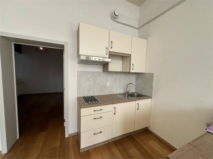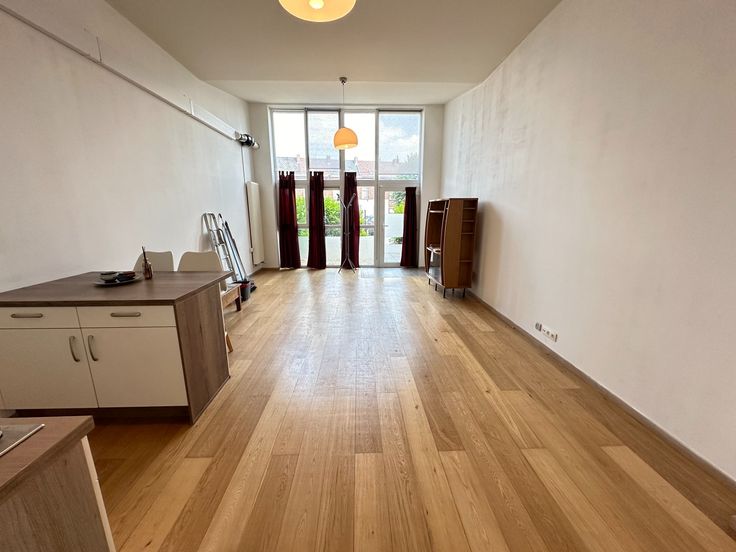 Il se compose d'un grand séjour comprenant une cuisine équipée ouverte (taques deux foyers, frigo encastré, hotte, four, évier, armoires de rangement), une salle de douche avec lavabo simple + WC, une chambre spacieuse de 14 m².