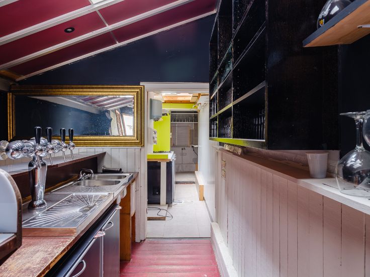 Het pand verspreid zich over 4 verdiepingen. Op het gelijkvloers vinden we een grote open ruimte met aan de voorzijde een open plaats (feestzaal, eetplaats…), bar en achterliggende keuken.