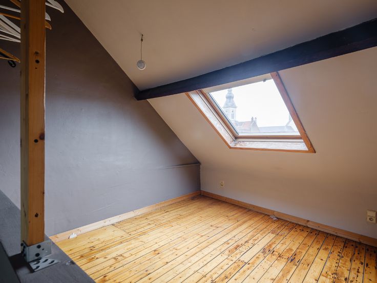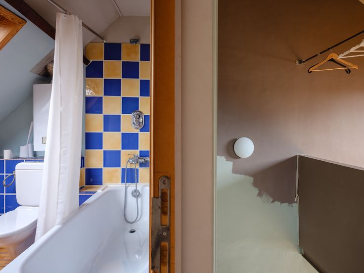 Daarboven hebben we nog een slaapkamer onder de nok en een badkamer met bad, wastafel en toilet.