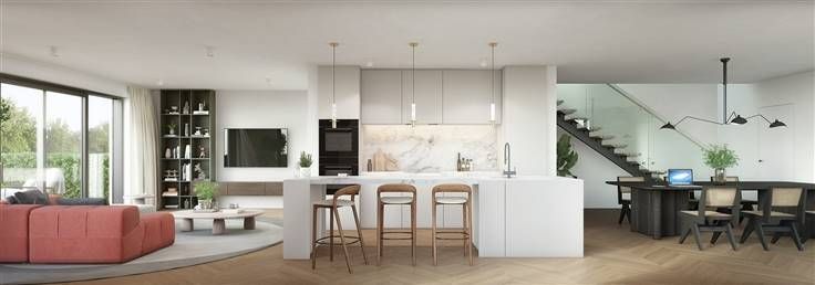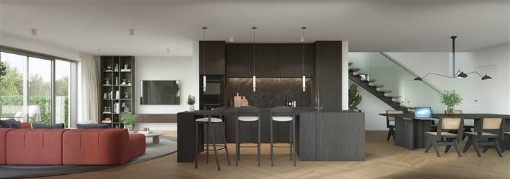 Vier nieuwe woningen worden gebouwd in een groene wijk in Grimbergen, waarbij veel aandacht is besteed aan het ontwerp om strakke architectonische vormen te creëren met hoogwaardige materialen. Daarnaast wordt er een sterke nadruk gelegd op duurzaamheid door middel van doorgedreven isolatie en innovatieve technieken die zorgen voor een E-peil 20! De woningen worden verwarmd met behulp van vloerverwarming die wordt aangedreven door een zuinige lucht-water warmtepomp en verlucht door middel van een systeem D. Elke woning wordt standaard uitgerust met zonnepanelen.