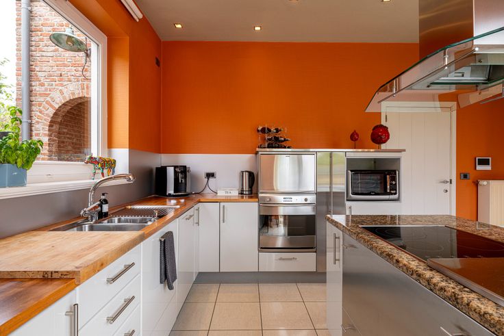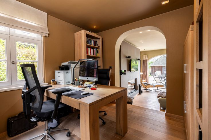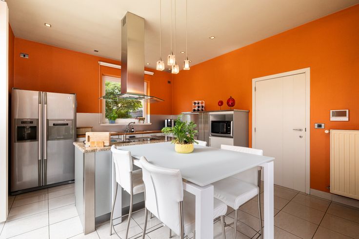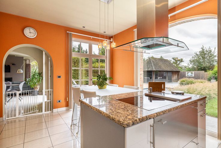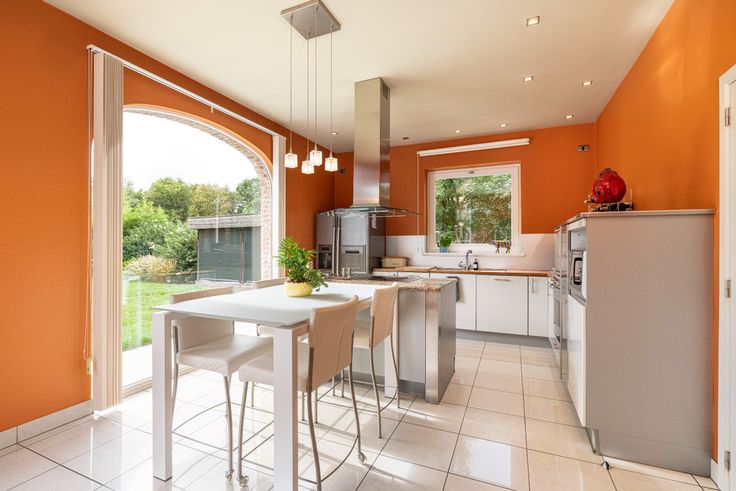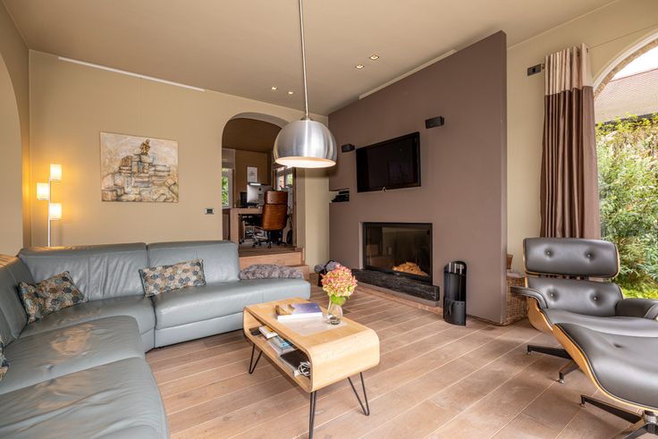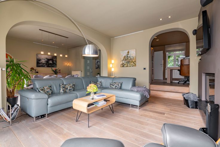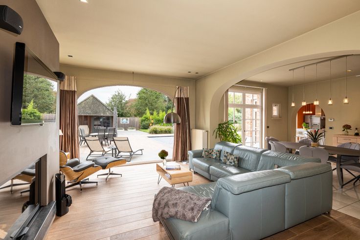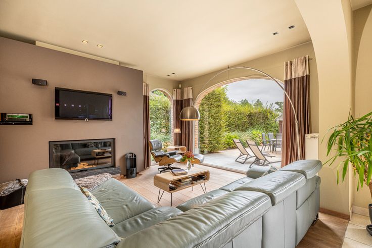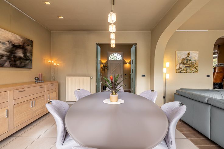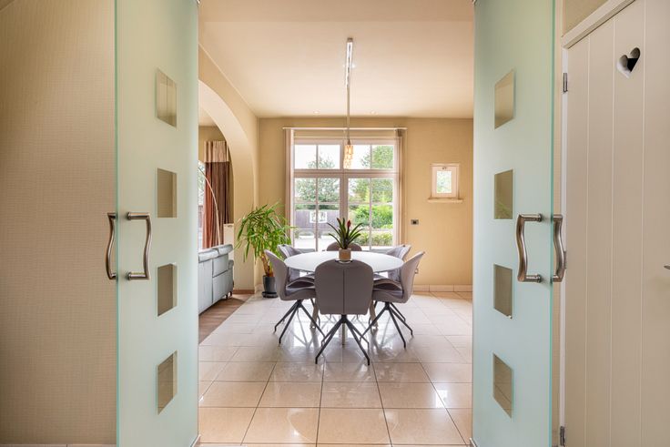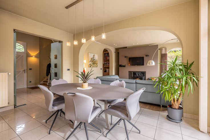 Al van bij het betreden van de inkomhal is meteen duidelijk dat er ook bij de binnenafwerking op dezelfde secure wijze werd gewerkt. Kleine details, zoals de ingebouwde verlichtingsspots in nagenoeg ieder woonvertrek, de keuze van lichtschakelaars, muurverlichting en verschillende op maat gemaakte meubels, geven het net dat beetje extra. De inkomhal vormt de overgang van de klassieke pastorijstijl aan de buitenkant, naar een eerder modern, warm interieur aan de binnenkant van de woning. De dubbele glazen deur in de inkomhal geeft toegang naar de leefruimte. Deze biedt plaats aan een zithoek en een eethoek. Er is veel lichtinval dankzij de grote ramen die tevens een volledig zicht naar de tuin en naar het zwembad geven. De massief eike