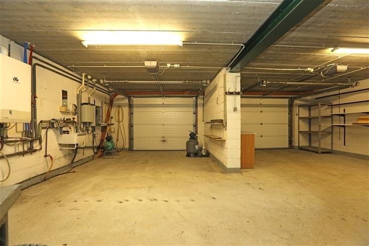 Gelijkvloers heeft 2 communicerende garages 27 en 31 m² met gemotoriseerde garage poorten, verwarmingsketel, wastafel, pomp voor de regenwatertank en technische aparatuur voor het recente zwembad buiten.