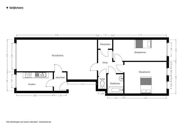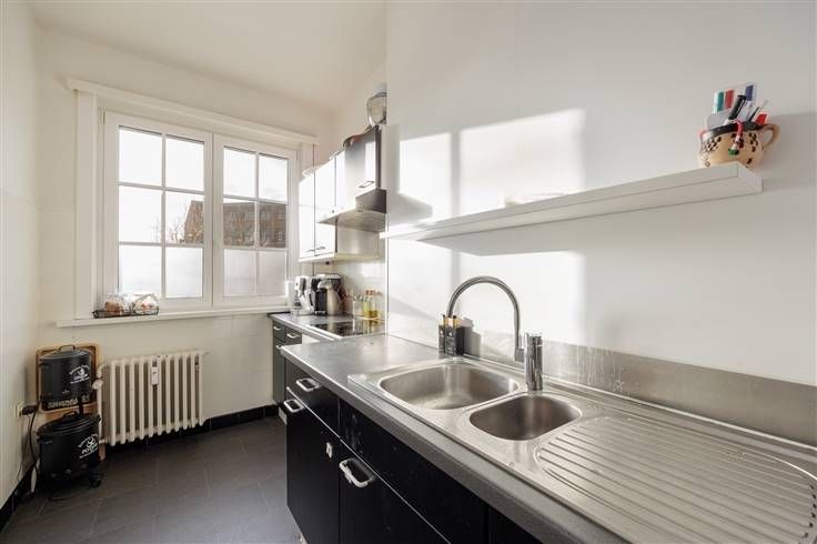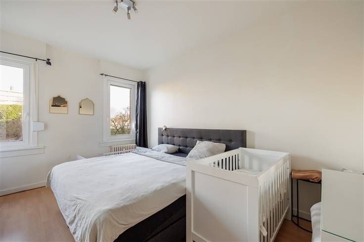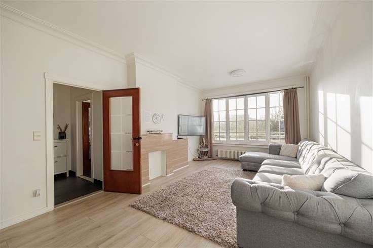 Je komt er binnen in de inkomhal met zn strakke donkerkleurige tegel, en loopt door de houten deur met glas richting leefruimte vooraan. Die mag je met zn 32 m2 gerust groot noemen, en heeft een laminaatvloer, hoge plafonds met sierlijsten en grote ramen waardoor het licht mooi binnenvalt. Je hebt hier heel wat plaats voor een grote zithoek en een eethoek. De lichte, betegelde keuken bevindt zich ernaast en heeft een elektrische kookplaat, dampkap, dubbele spoelbak, oven en heel wat kastruimte. Je kunt ze gewoon zo laten, of opteren om op termijn bij een renovatie de muur naar de leefruimte open te breken voor een echte leefkeuken-op-maat. Vanuit de leefruimte wandel je door naar de achterliggende nachthal op een charmante tegel in wit-groene dambordmotief, de spil van het appartement waarop alle andere ruimtes uitkomen. Je vindt hier een apart toilet, een berging en een eenvoudige wit betegelde badkamer met een douchecabine en een lavabo met spiegel. De twee ruime slaapkamers bevinden zich aan de rustige achterzijde en hebben allebei een lichte laminaatvloer. Deze kijken uit op de groene tuinen van je buren. Beide slaapkamers zijn tevens uitgerust met rolluiken. P.S.: De foto's die in de advertentie worden gebruikt zijn beelden van het appartement op de eerste verdieping. De staat en indeling zijn identiek. Meer info: https://www.immovasta.be/panden/gegevens/13415/
