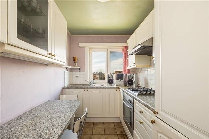Recht voor je heb je de betegelde leefruimte, een zonovergoten plek van maar liefst 30,5 m², met z’n hoekligging en vele hoge ramen een heerlijke ruimte om een groot salon en een eethoek in neer te zetten. De geïnstalleerde en praktische L-vormige keuken bevindt zich in de hal rechts achteraan. Je hebt hier een tegelvloer, spatwand, gasfornuis, dampkap, dubbele spoelbak, oven, koelkast en heel wat kasten. Aan de granieten tafel zet je met gemak twee stoelen – een prima ontbijthoekje dus!