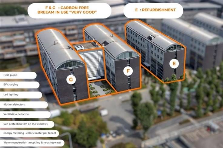 Gerenoveerde kantoren nabij de afrit E40 (Merelbeke). Zeven gelijkvormige kantoorgebouwen, gelegen in het bedrijvenpark Axxes Business Park te Merelbeke. Waarvan gebouwen E, F en G werden onderworpen aan een grondige renovatie. De gebouwen hebben telkens 5 verdiepingen waarbij er diverse mogelijkheden zijn om te gaan combineren in oppervlaktes. Minimale oppervlakte per verdieping is 198m². Landschapskantoren van ca 200m² tot 7.500m² (totaliteit van gebouw F en G die op alle verdiepingen verbonden zijn met elkaar). - parkeerratio: 1/26m² - parkeerplaats € 850/plaats/jaar - Ondergrondse parkeerplaatsen € 1.250/plaats/jaar - 58 electrische oplaaadpunten