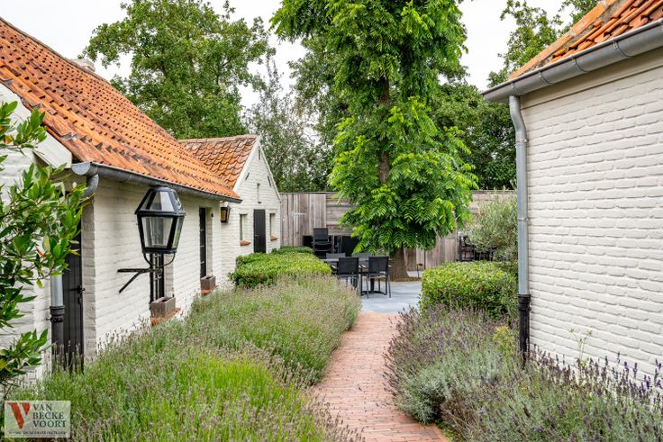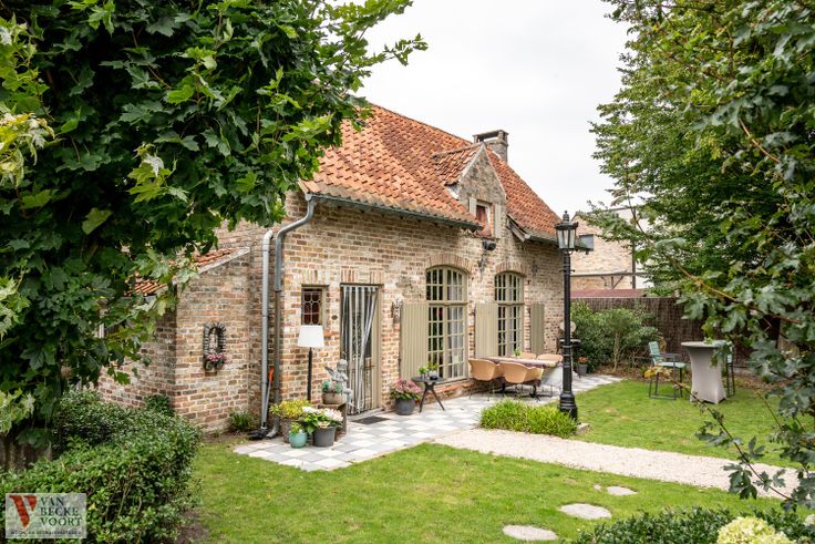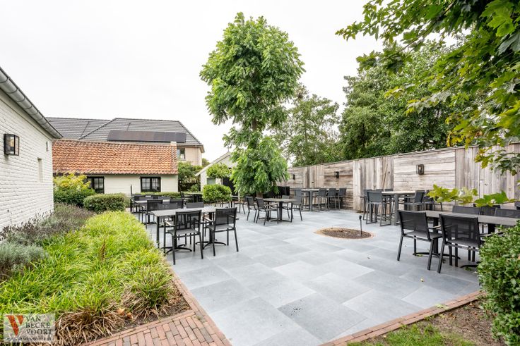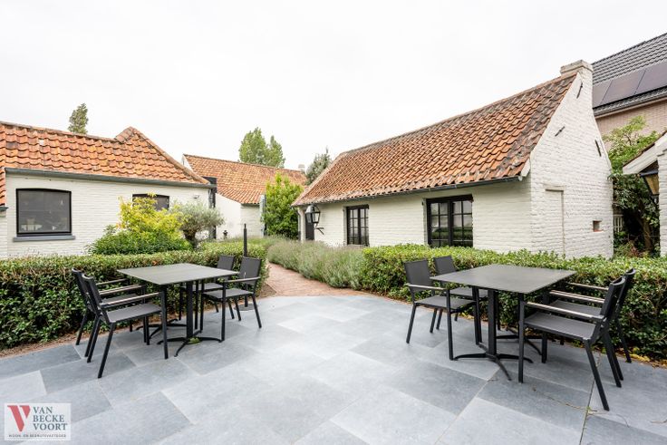 Achterterras met tuin voor 55 personen - met zicht op de oude ambachtshuisjes - 2 ambachtshuisjes waarvan 1 ingericht als kantoor-woonruimte, 2de ambachtshuisje harmonieus ingericht als woning.