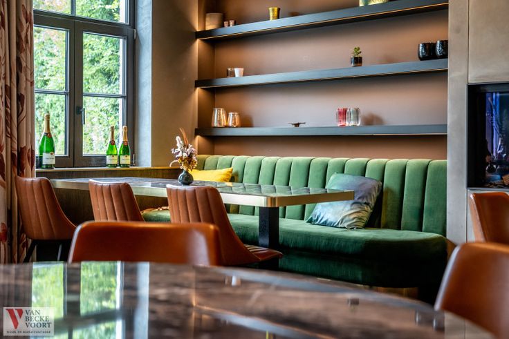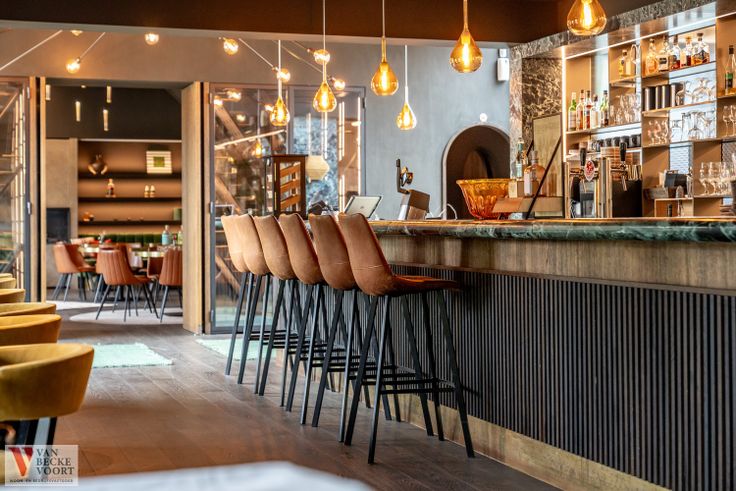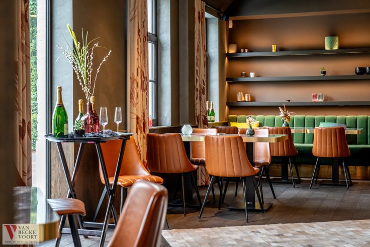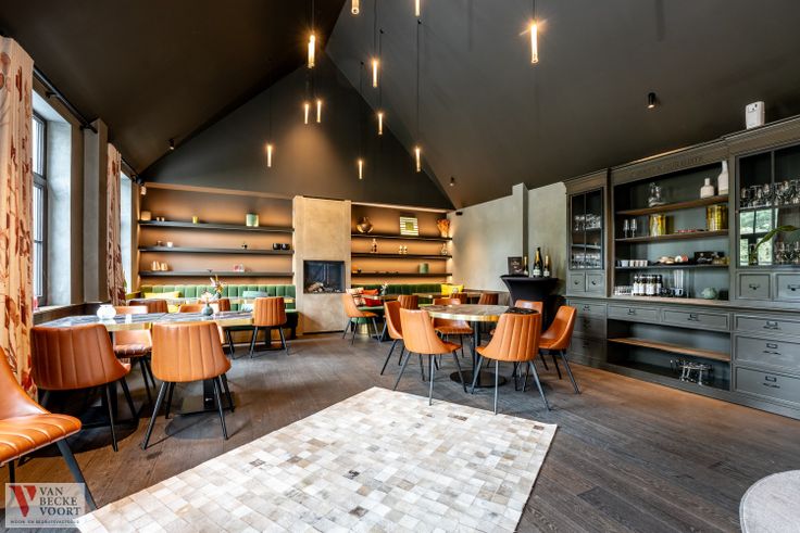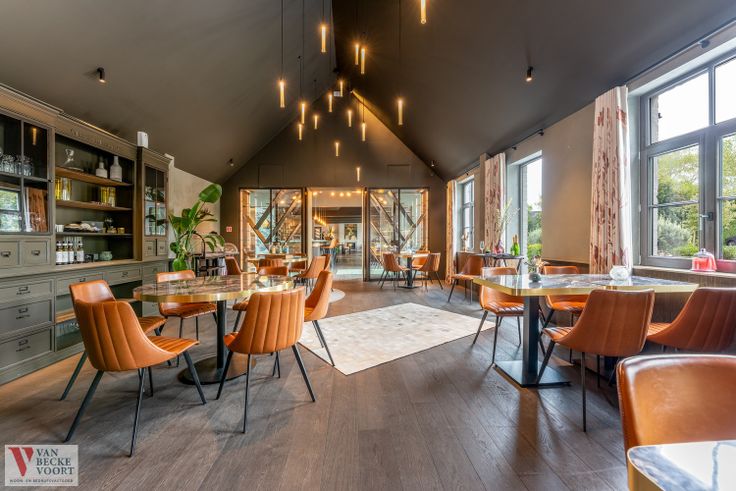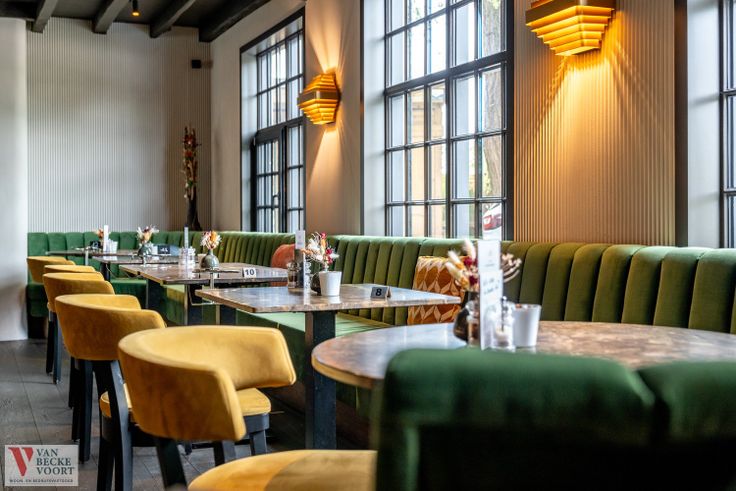 Kwaliteitsvol restaurantmateriaal aanwezig, voorzien voor de volle zaalcapaciteit – aangepaste sfeerverlichting – design zaalmeubilair in perfecte s...