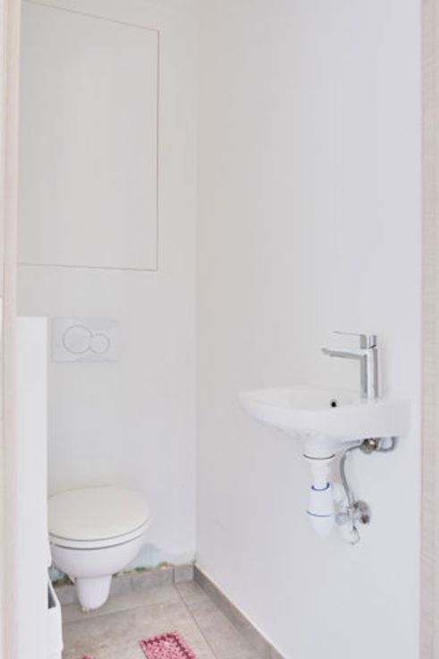 Op de begane grond is de ingang direct in de woonkamer, gevolgd door de ingerichte keuken, een toilet en een bijkeuken.