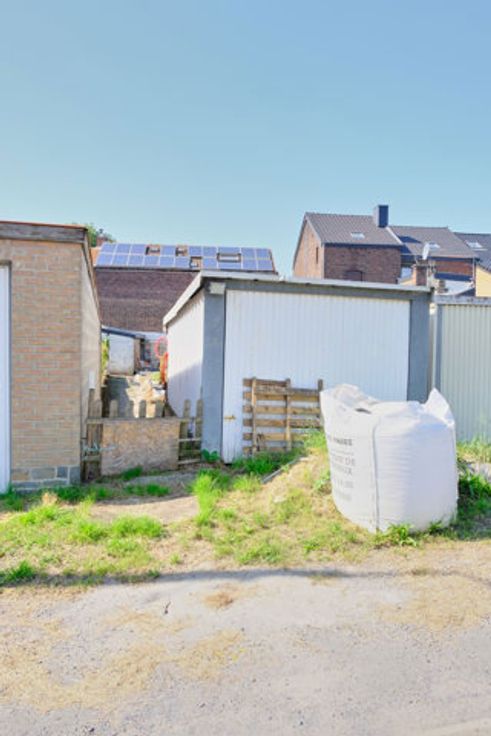 De tuin met een garage aan het einde.
