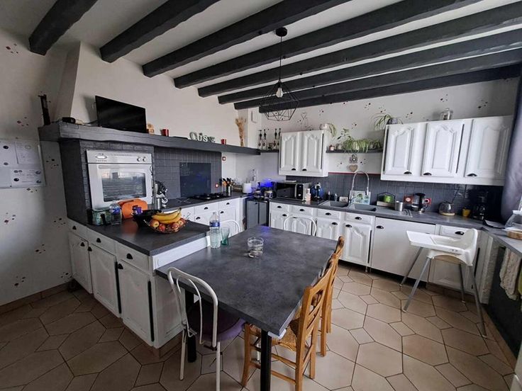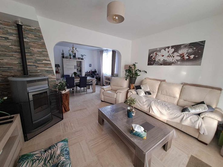 Elle est composée d'une belle entrée, séjour double avec poêle à pellets, cuisine, salle de bain, wc indépendante et 3 chambres.