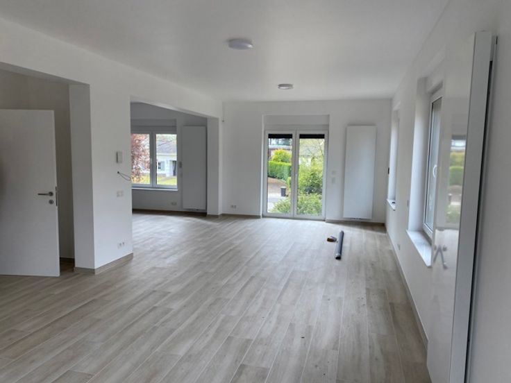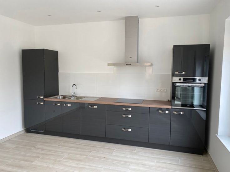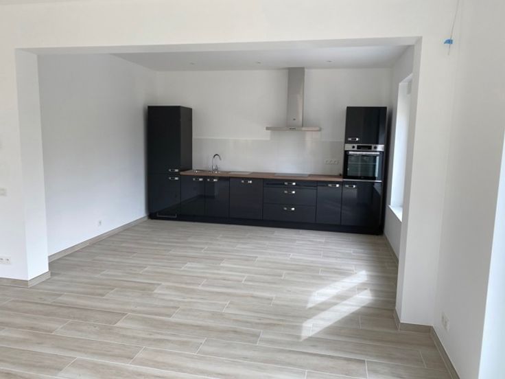 Niveau tuin: Inkomhal, WC, ruime living met open volledig ingerichte keuken, terras en tuin.