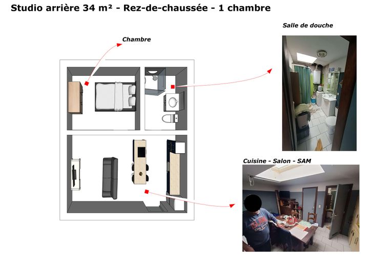 Studio arrière: une salle de douche, une chambre, un espace salon, sam et cuisine équipée.