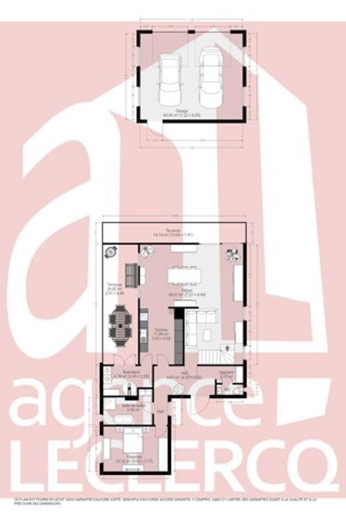 A l'extérieur : grand jardin et terrasse exposés sud-ouest et double garage accessible via l'arrière.