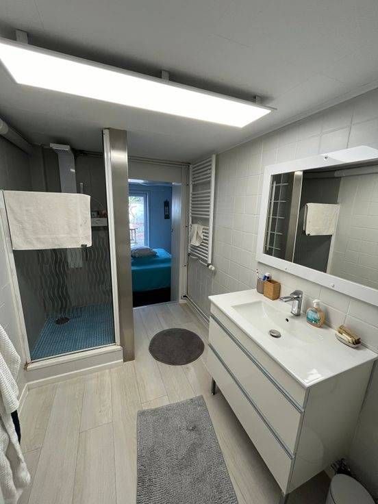 2 doucheruimtes, 1 badkamer. Viessmann condensatieketel, elektriciteit volgens de voorschriften, dubbele urenteller. Ramen met dubbele beglazing en elektrische rolluiken. Beuken trappen, massief eiken deuren. Melamine parketvloer, tegelvloer op tuinniveau. Volumetrisch alarm. Internet: glasvezel in aanleg.